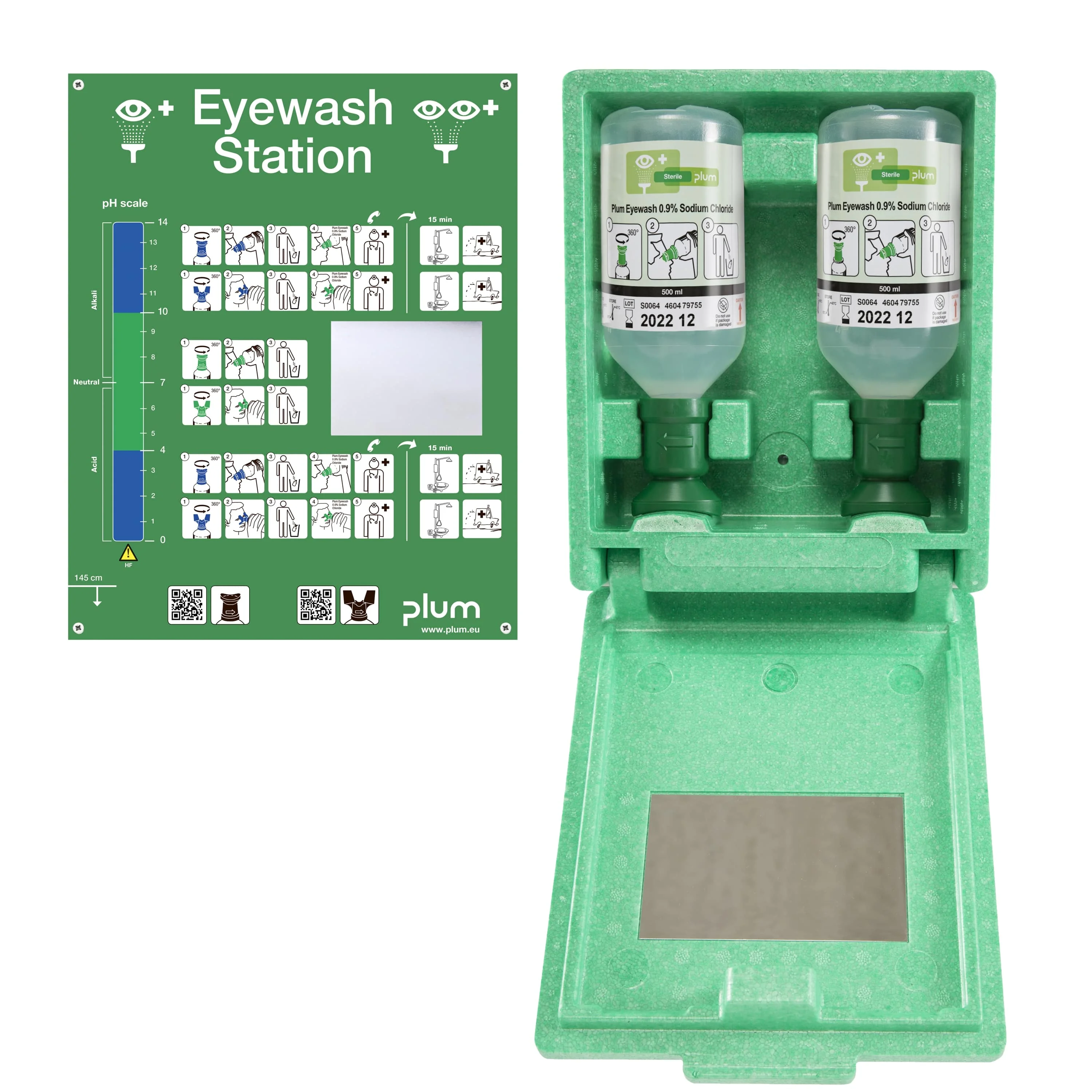 Coffret mural étanche à la poussière en polystyrène résistant aux chocs contenant 2 flacons 500 ml lave-œil Plum de solution ophtalmique. Spécialement adapté aux sites exposés à la poussière et aux postes mobiles, présentant un risque d‘accidents oculaires impliquant des corps étrangers.